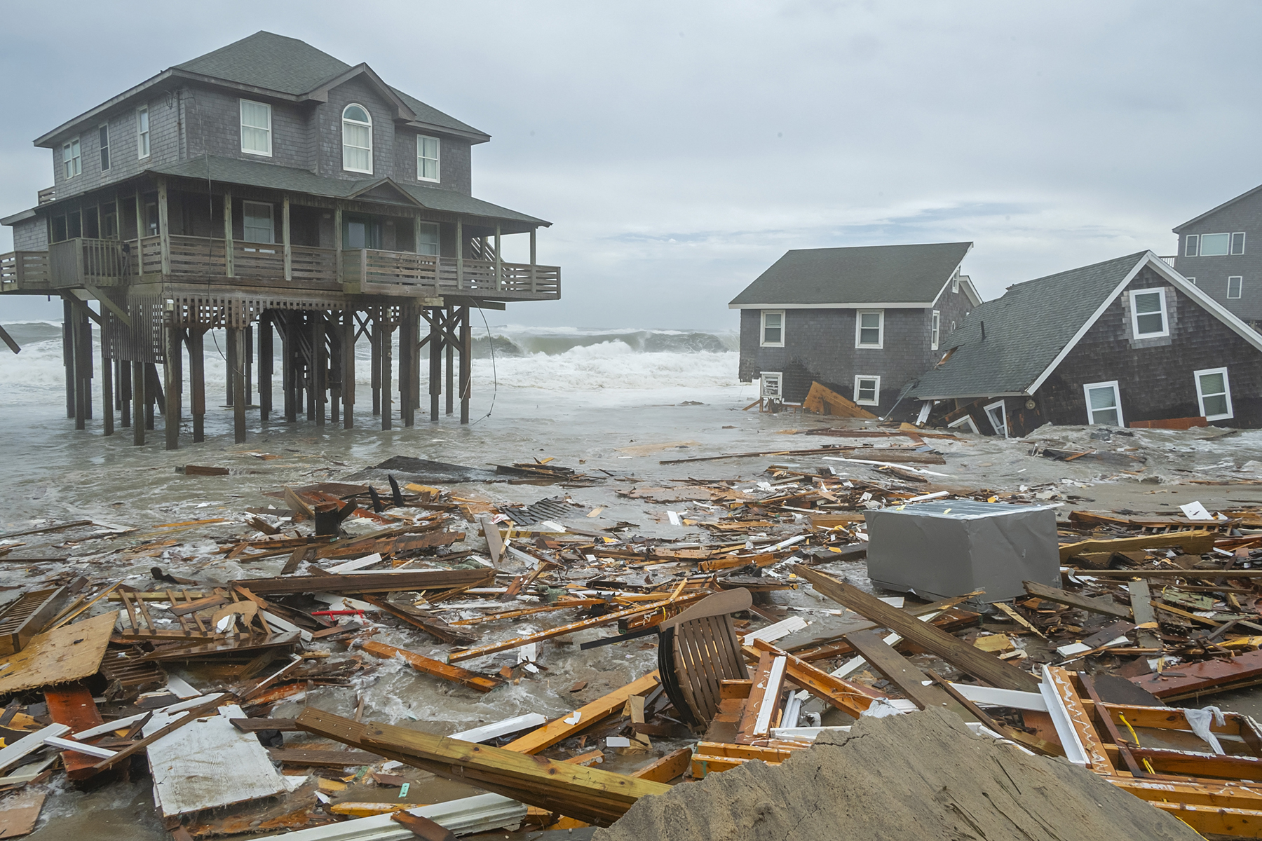 As a rugged nor’easter made its way up the Atlantic seaboard, snow, heavy surf, and ice blanketed the ribbons of sand along Cape Hatteras National Seashore, leading to the collapse of four more homes in the Buxton community. After a devastating fall along the barrier islands that saw the collapse of more than 15 homes into the ocean, this most recent storm event is a reminder that the barrier island chain is vulnerable to erosion and the increasing impacts of climate change year round — particularly as no clear pathway for protection, or rather, adaptation, along this dynamic coastal area has emerged since homes in Buxton started collapsing in the fall.